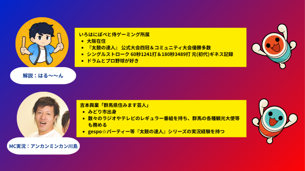 解説は、いろはにぽぺと侍ゲーミング所属で『太鼓の達人』 公式大会四冠&コミュニティ大会優勝多数