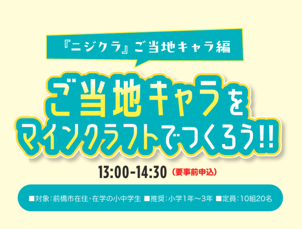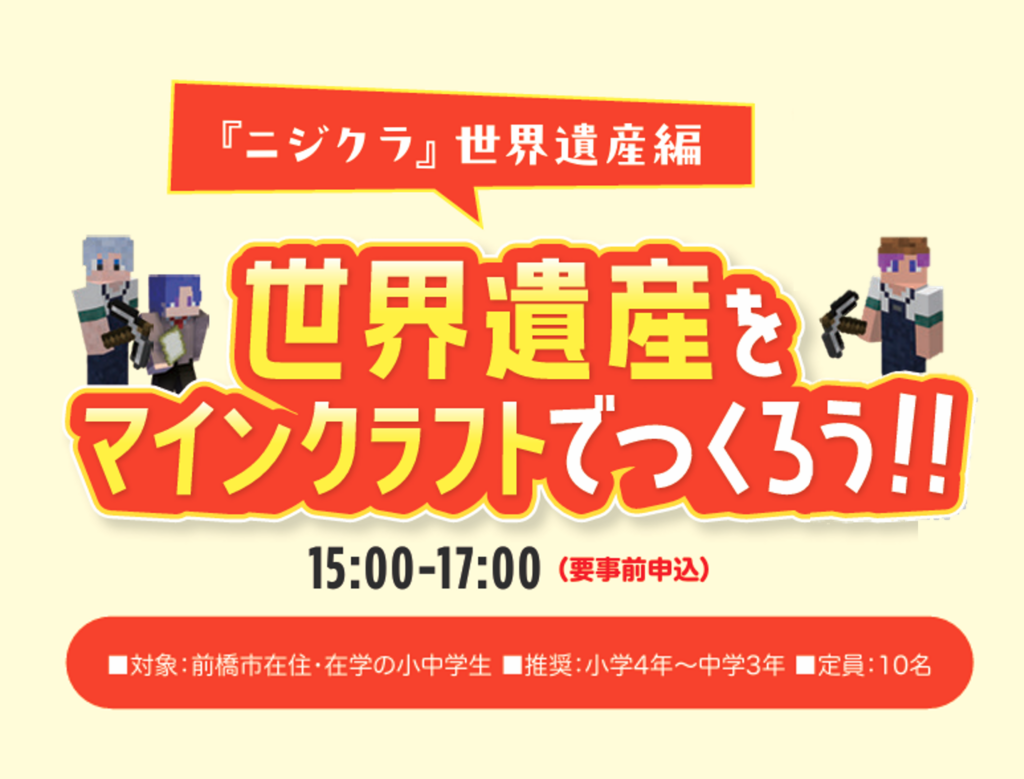 ※当日は水筒やペットボトルなどフタ付きの容器に入った飲み物のみ持ち込み可能です。 ※本教材はMinecraft 公式の製品やサービスではありません。Mojang または Microsoft から承認されておらず、Mojang または Microsoft との関連性もありません。 ※NOT AN OFFICIAL MINECRAFT PRODUCT. NOT APPROVED BY OR ASSOCIATED WITH MOJANG OR MICROSOFT. ※本教材に関する内容に関して、Mojang Synergies AB へお問合せされませんようお願い致します。 ※Mojang ©2009-2025.「Minecraft」は Mojang Synergies AB の商標です。